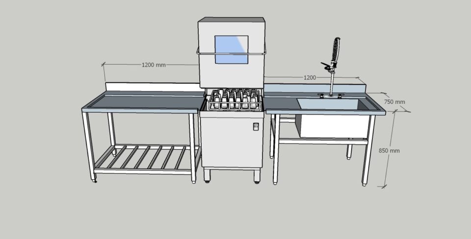 • – Bộ bàn dành cho máy rửa chén. Bao gồm bàn chứa vật dụng đã sử dụng (vật rửa- chén, dĩa, ly… đã sử dụng) gọi là bàn bẩn và một bàn dành để chứa vật dụng vừa rửa xong từ máy rửa chén gọi là bàn sạch – Khuyến nghị: cao